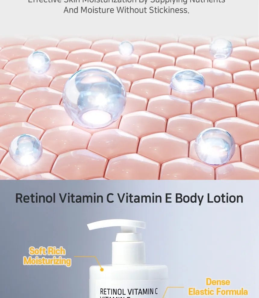 يوفر غسول الجسم الذي يحتوي على الريتينول وفيتامين C وفيتامين E تجديدا جديدا للرطوبة وتأثيرا مهدئا للبشرة الجافة.